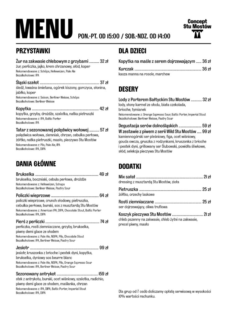 W Stu Mostach kształtuje się wyobrażenie czym może być kuchnia dla piwa. Pub, w którym przygotowuje się dania pod piwa i uczy dobierać piwa do dań. Na Długosza 2 we Wrocławiu, kucharze i piwowarzy codziennie ze sobą współpracują.
